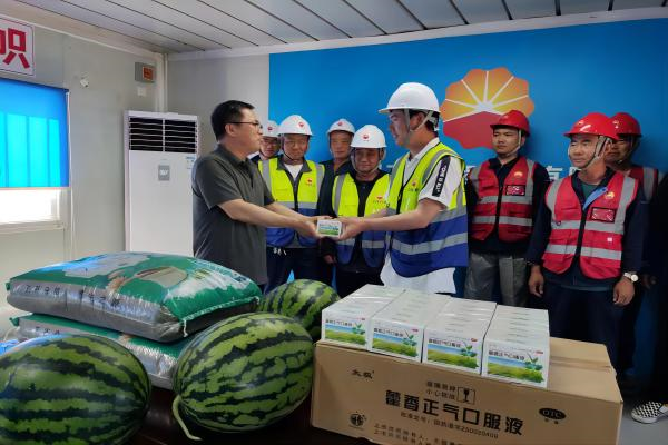 因近日持续高温,现场的施工环境给坚守一线的施工人员带来了严峻“烤”验,也时刻牵动着分公司领导的心。6月12日,分公司党支部书记、工会主席臧联合到项目部详细了解一线人员工作和生活情况,检查消防和防暑降温工作,为大家发放了西瓜、绿豆、藿香正气口服液等防暑物品,为高温下坚守岗位的项目职工带来了“娘家人”的问候和关怀,并叮嘱大家要在保障自身安全前提下完成好项目工作。