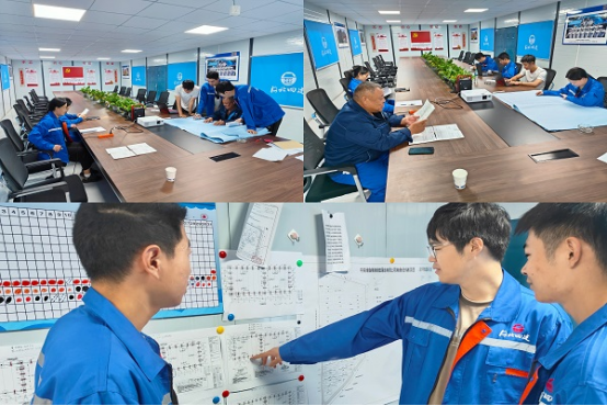 夜晚,成员们针对设计图纸与现场施工轴线不一致的情况,通过互联网进行学习,使用 GPS 为平房仓轴线定位。在工地上,成员们按照图纸内容严格执行地梁箍筋间距、桩顶标高等的规范要求,遇到不明白的地方就向工地上的老师傅请教,共同探讨。他们将所学内容与实际工作紧密结合,形成学和用的良性闭环。每周三晚上的问题交流会,以“互动式、聊天式”的学习方法,调动成员学习兴趣和热情。大家集思广益,解决实际问题,激发创新思维和工作热情。